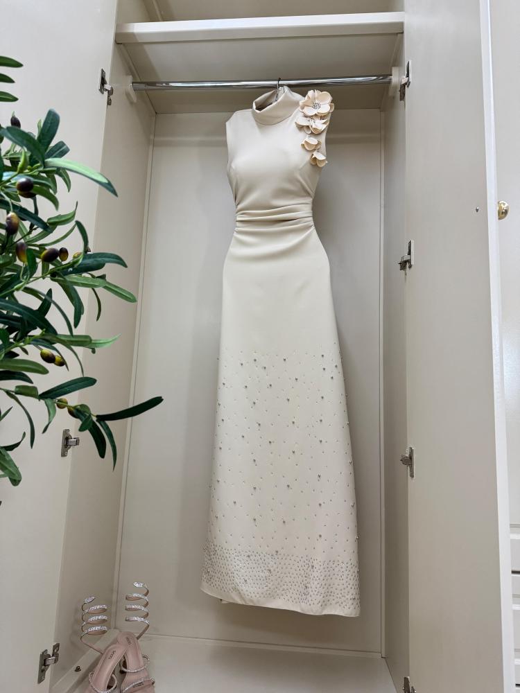 فستان بيج مزين ورود