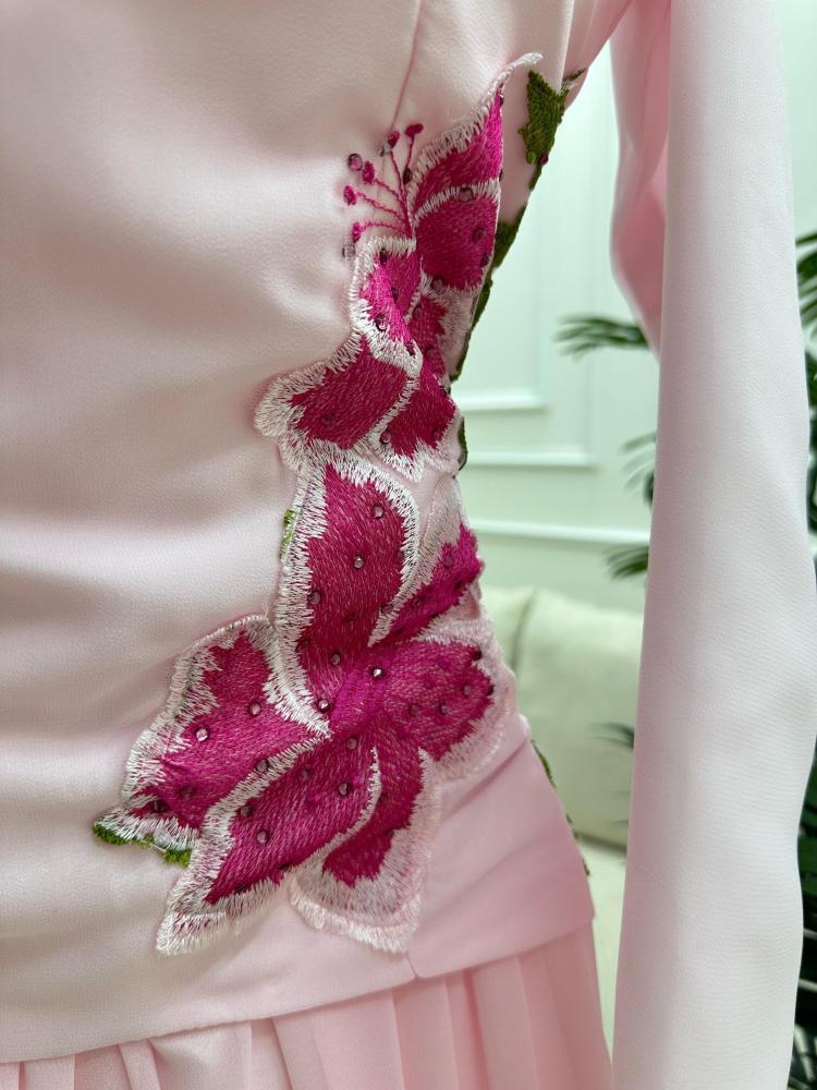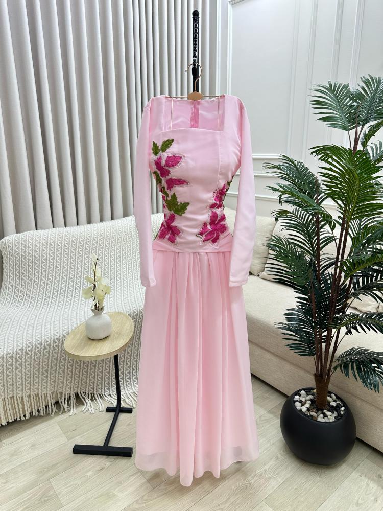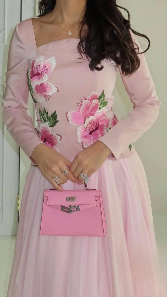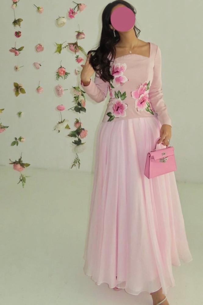 الخامه/ شيفون مبطن + تطريز كمبيوتر وفصوص