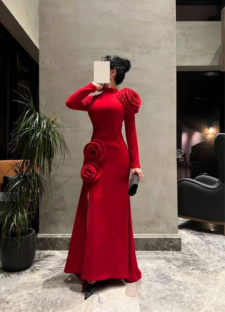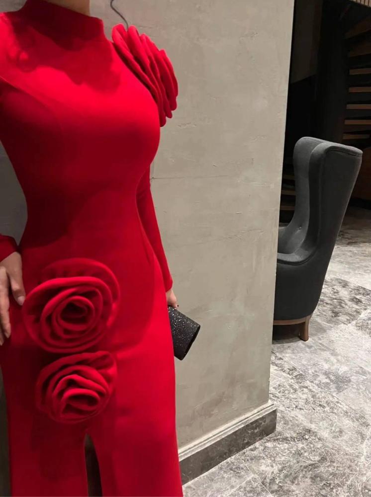 وصف الفستان: فستان احمر انيق بورود راقيه