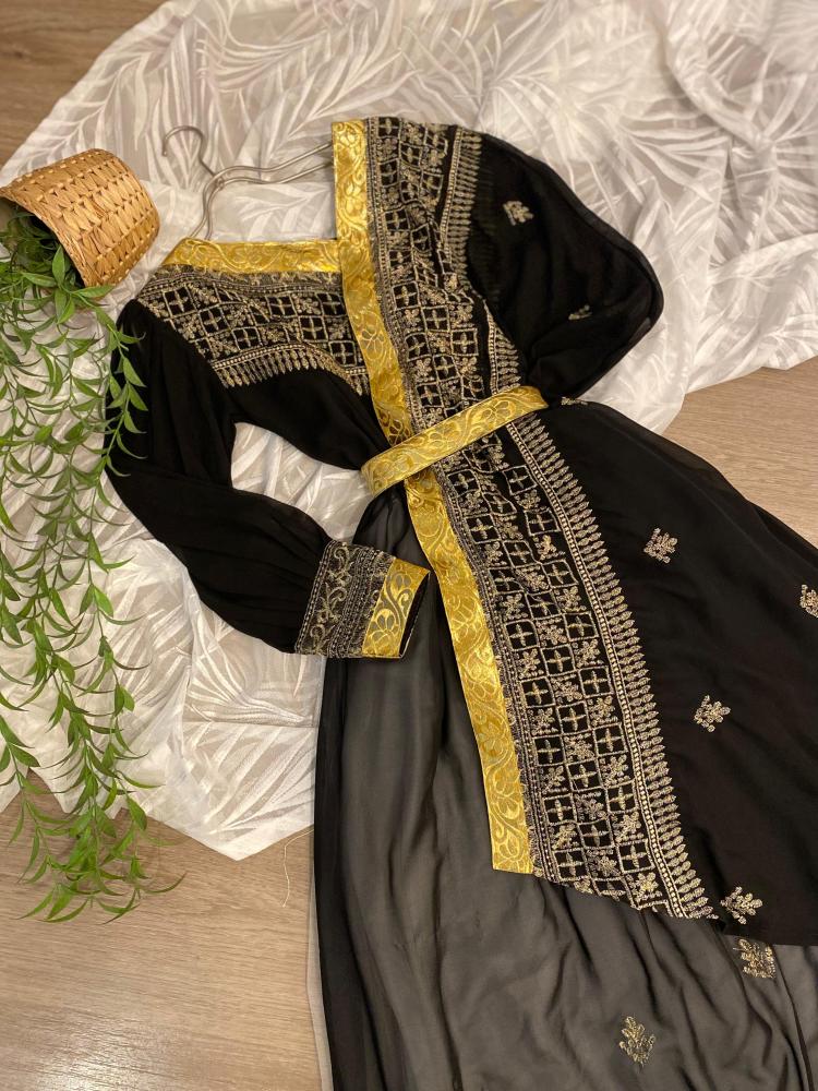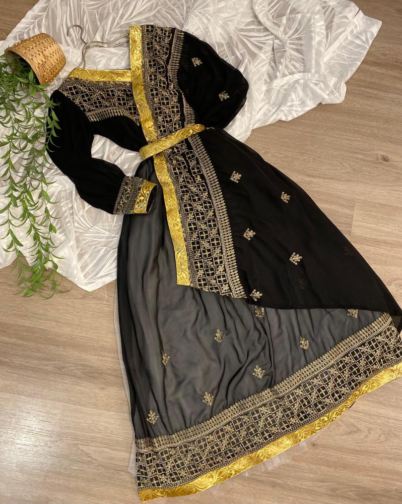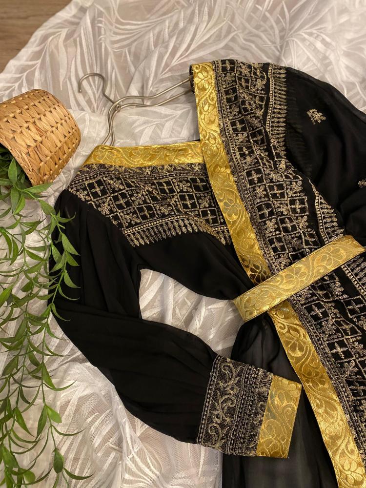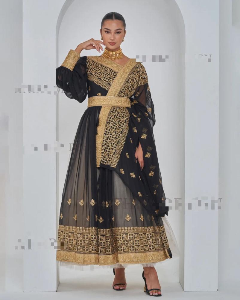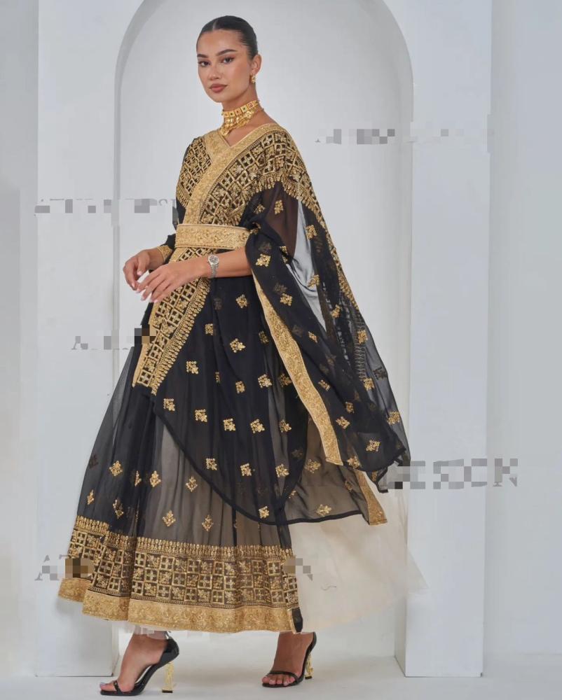الخامه / شيفون جورجيت + مبطن تفته + تطريز كمبيوتر ذهبي