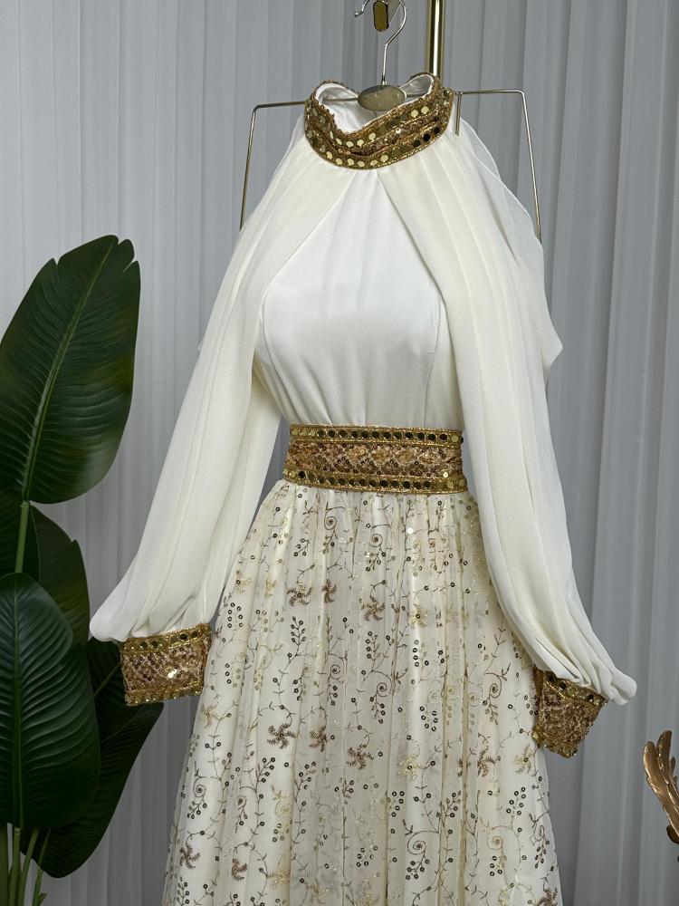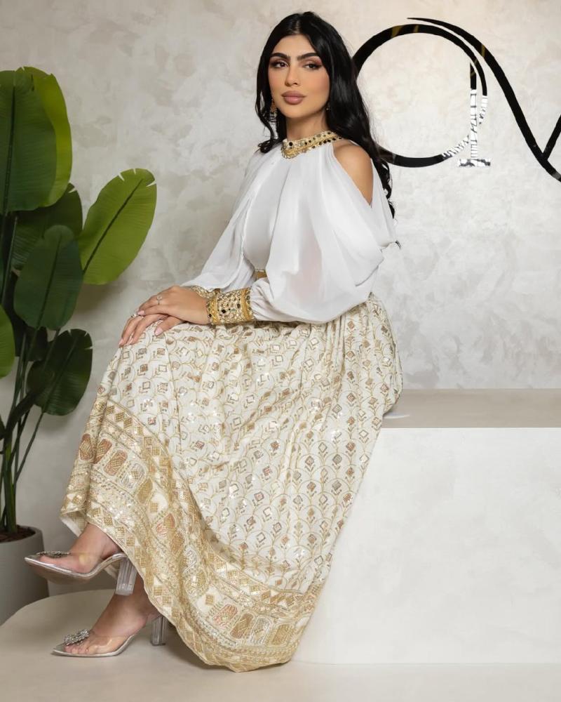 الخامه/ شيفون مطرز كمبيوتر +مبطن تفته ناعم + كلفه ذهبي