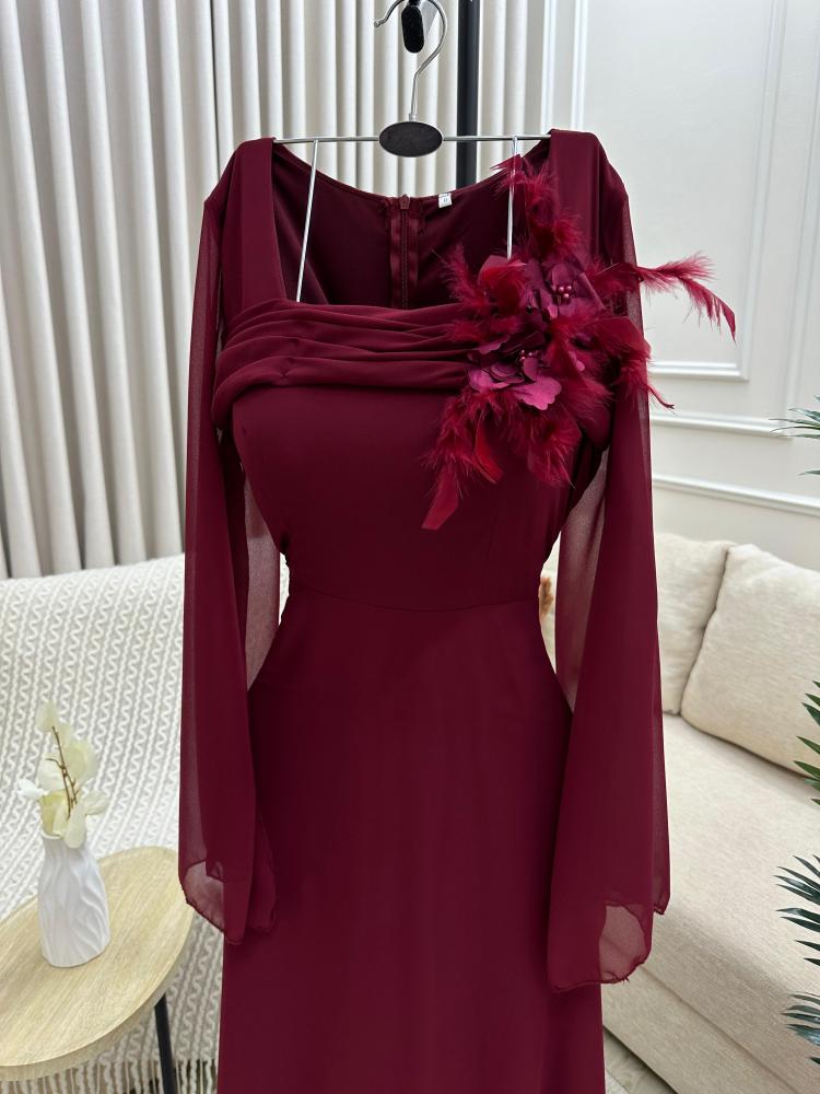 فستان عودي انيق مزين ورود وريش